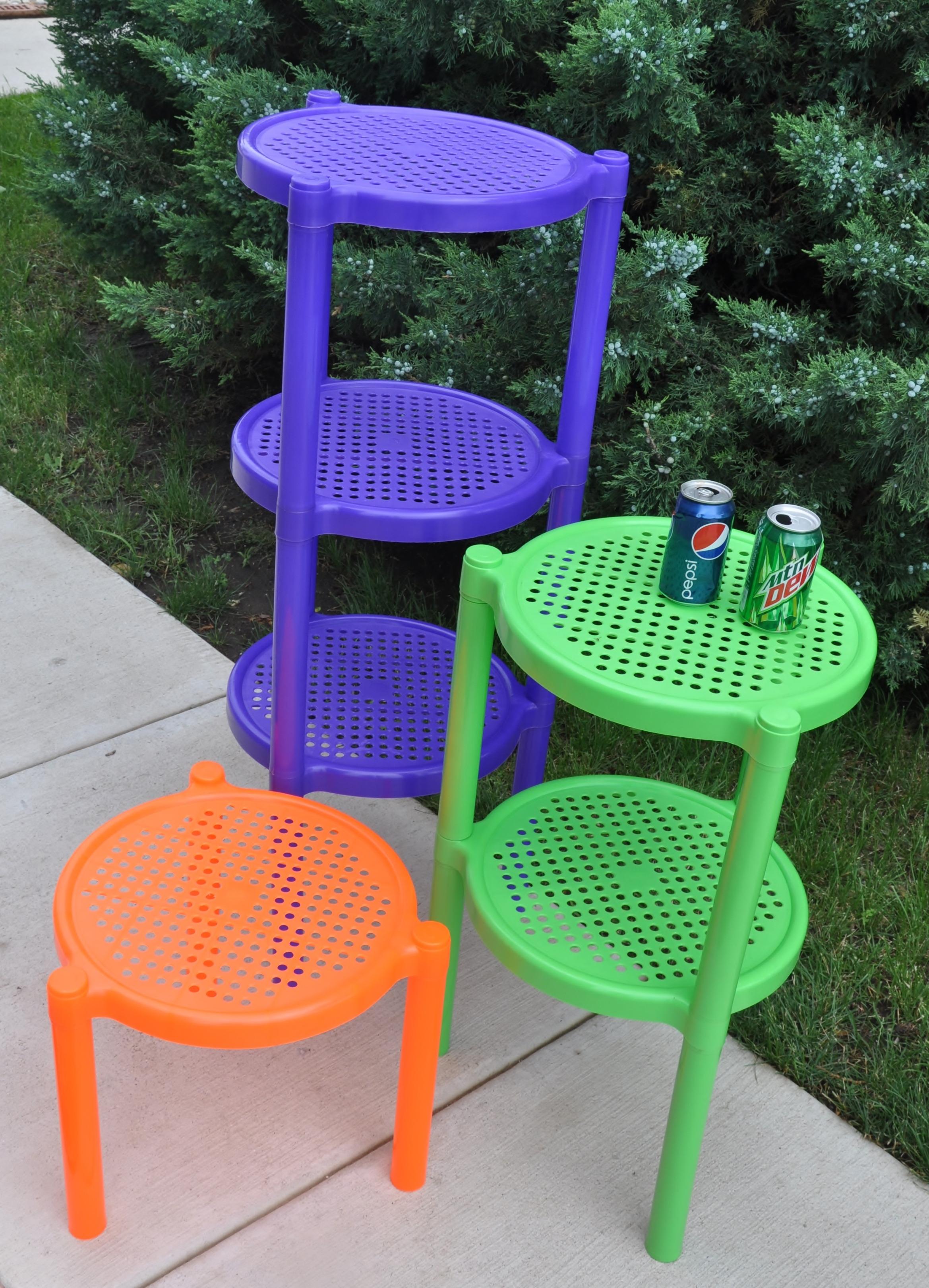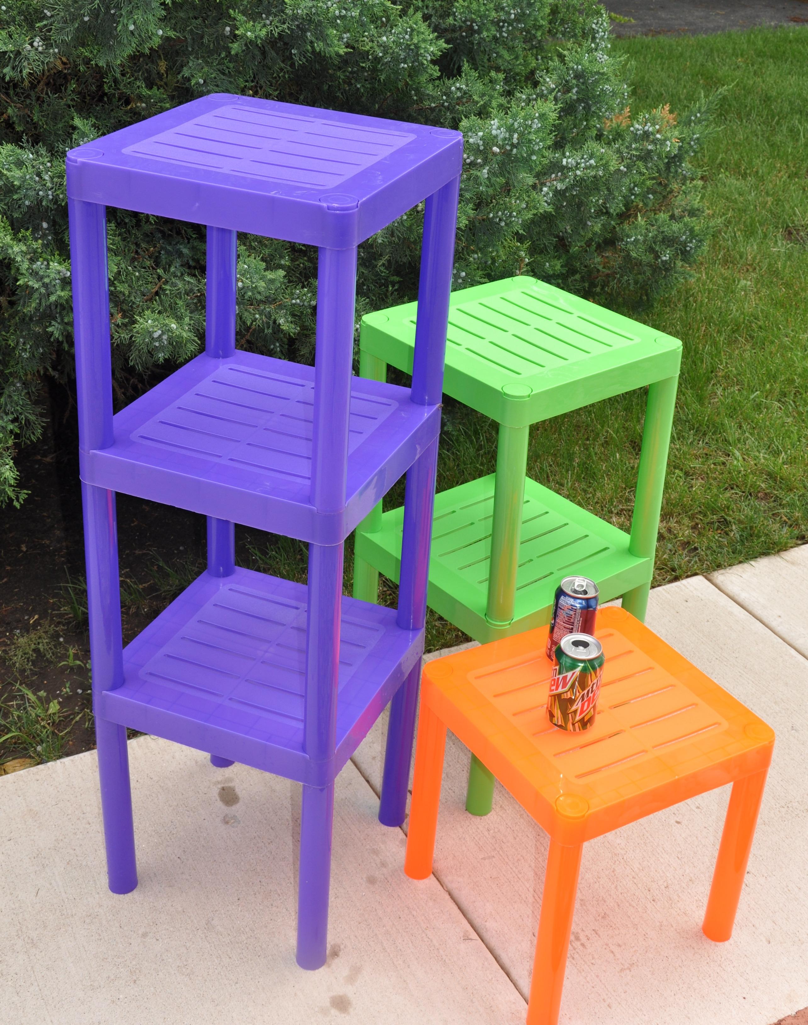 These tables are constructed for indoor and outdoor use from resin that can be recycled. Waterproof and easy to clean. Width: 14"-15" square or diameter Overall height: 15" Set of 10