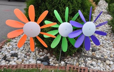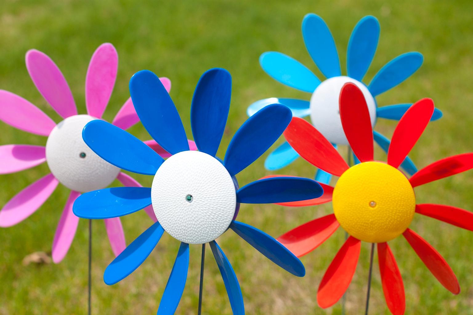 Sold in sets of 6,12 and 24 Daisies unassembled and 24 in a PDQ. Looking to add a splash of color to your lawn? Look no further! Our spinning daisies plant straight into the ground and use wind power to create a brilliant display of color and motion. The vibrantly colored 10 petal design makes for a wonderful sight. Our aesthetically pleasing plastic wind spinner can also improve on the life of your garden or lawn. According to folklore the spinning motion of the petals sends vibrations into the ground through the metal stem, effective in keeping ground critters away from the area. They have even proven effective in keeping birds from picking fruit from gardens! Our daisies can come in a variety of color sets to go with holidays, sports teams, or causes. Custom colors and varieties may be available upon request, making them a great item to sell for fundraisers or to promote events, schools, and businesses! The flower’s petals and center are both plastic molded, with a diameter of 11.5 inches and made to withstand strong winds and all that the seasons may have to offer. The stem consists of a 22 inch steel rod and a plastic molded axle that when joined with the petals, becomes permanently affixed. To assemble the flower, simply press the plastic axle into the back of the petals. Our daisy themed garden wind spinners are a high quality product for a cheap price!