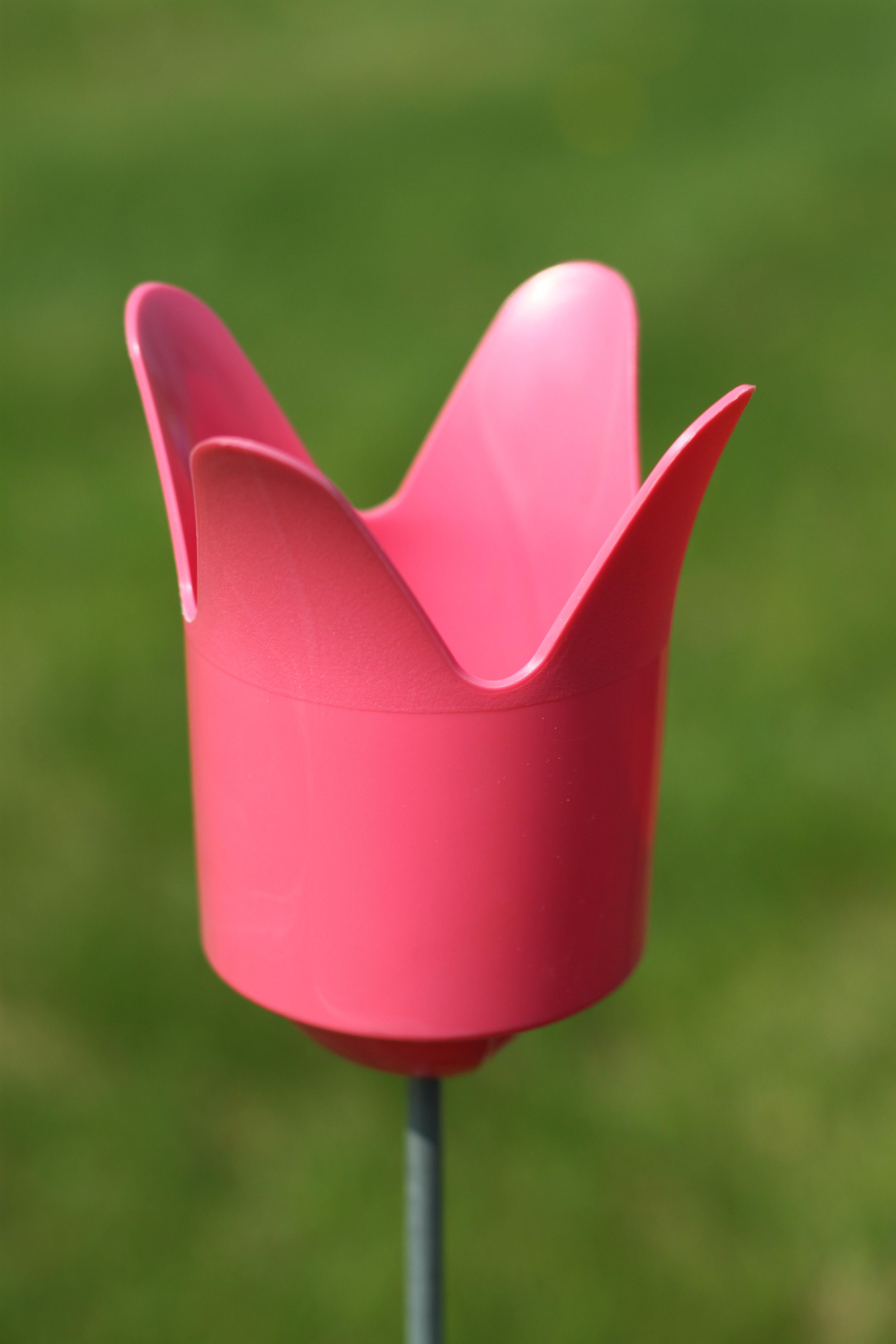 Tulip shaped flower on a sturdy steel rod makes for an attractive yard ornament. One-piece plastic molded flower head with drain holes.This piece works great in groups for decoration, and can be used individually as a can holder, candle holder or with LED lights to illuminate a pathway. Special orders and variety are available. Flower Diameter: 3.5" Overall Height: 26.5" Set of 16
